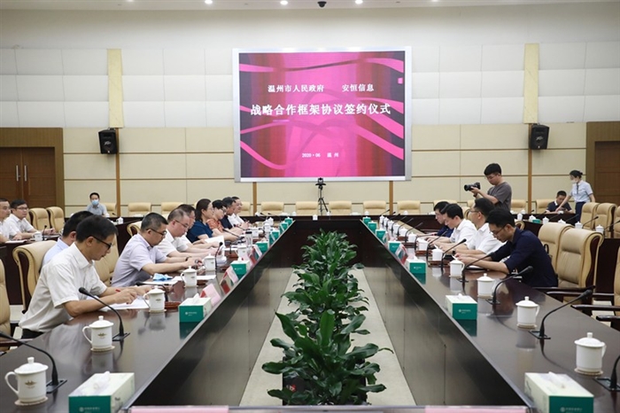 本网讯 为顺应当下数字经济及网络安全发展态势,增强网络安全保障能力, 6月23日下午,温州市人民政府与杭州安恒信息技术股份有限公司签署战略合作框架协议。温州市人民政府常务副市长陈建明,杭州安恒信息技术股份有限公司(以下简称“安恒信息”)董事长兼总裁范渊、我校校长方益权等出席签约仪式。仪式由市委副秘书长、市委宣传部副部长、网信办主任王丹主持。