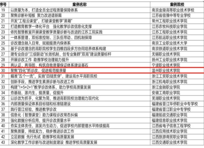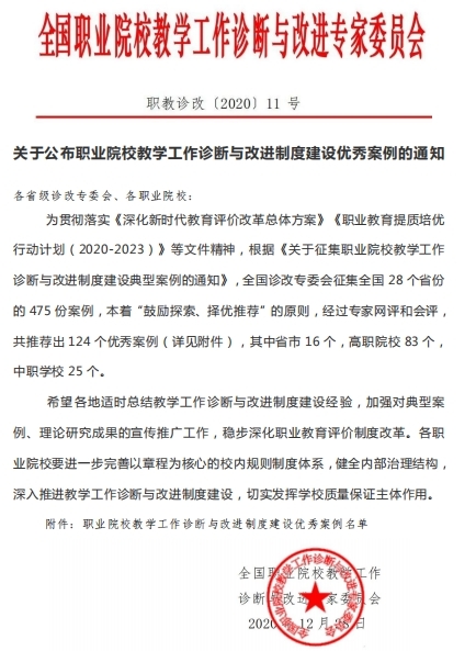本网讯 近日,全国职业院校教学工作诊断与改进专家委员会公布了“职业院校教学工作诊断与改进制度建设优秀案例”,我校教学质量监控处方倩如老师执笔的诊改案例《聚焦“四化”抓诊改,促进规范提质量》成功入选。