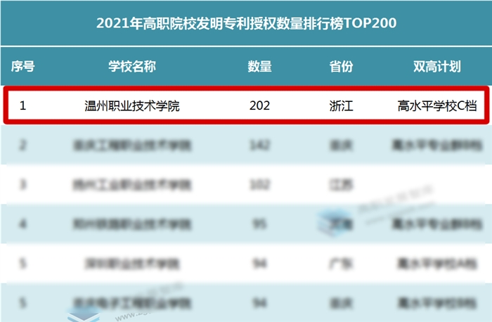 本网讯(科技开发处通讯员 倪红红) 近日,高职发展智库公布了2021年高职院校发明专利授权数量排行榜。我校继续领跑,共获得发明专利授权数202件,位居全国高职院校首位,大幅领先其他高职院校。这是我校连续第四年蝉联该榜单第一名,充分展现了我校强大的科研实力及创新能力。