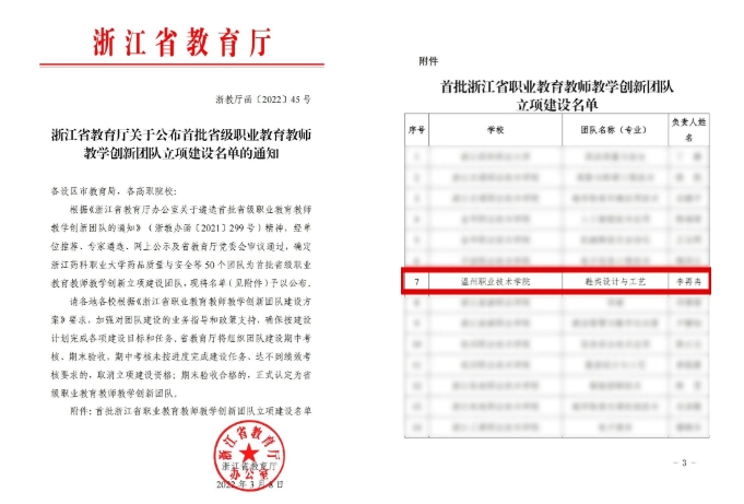 本网讯(教务处通讯员 董瑞峰)近日,浙江省教育厅公布首批省级职业教育教师教学创新团队立项建设名单,我校鞋类设计与工艺专业教学团队成功入选。
